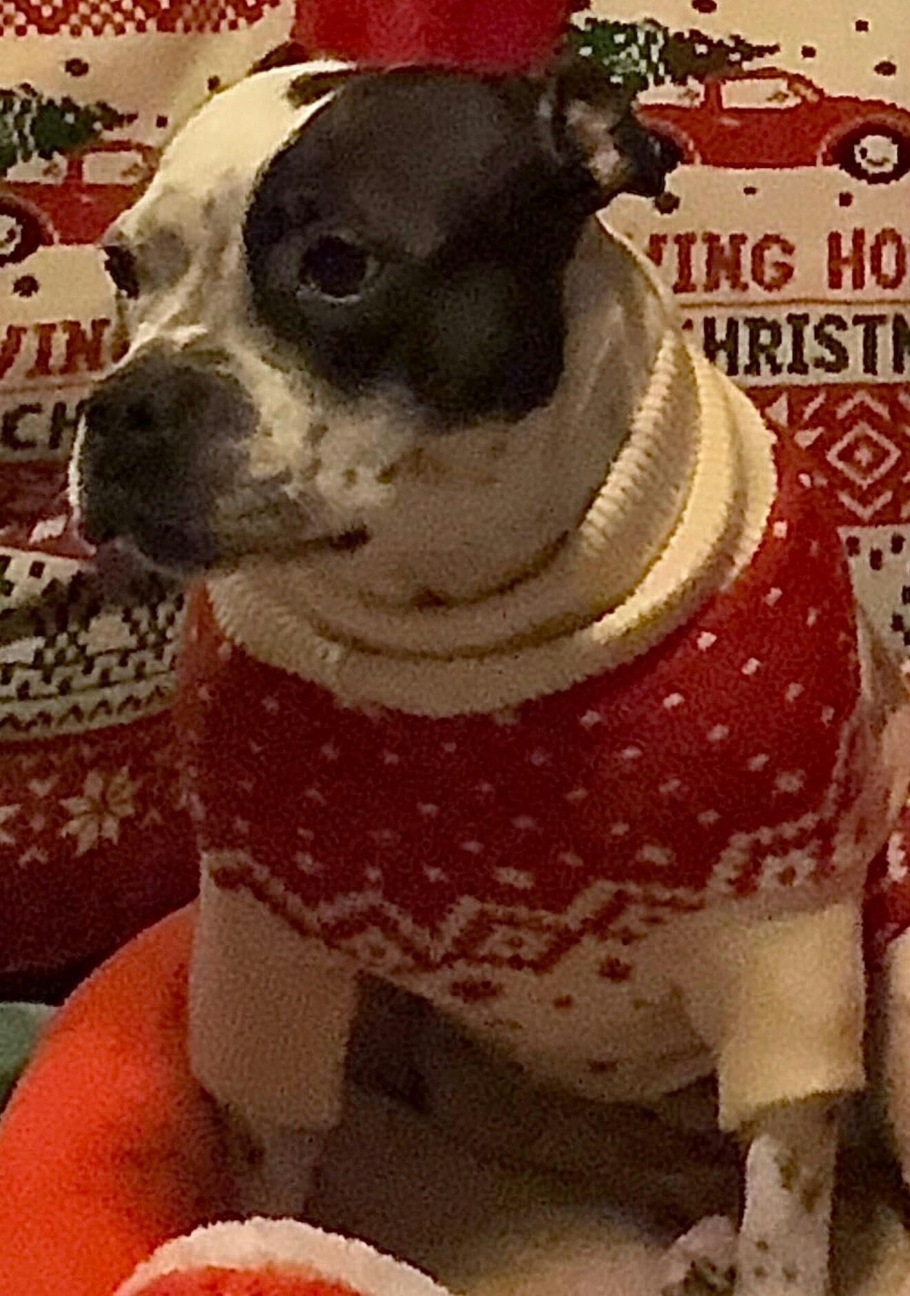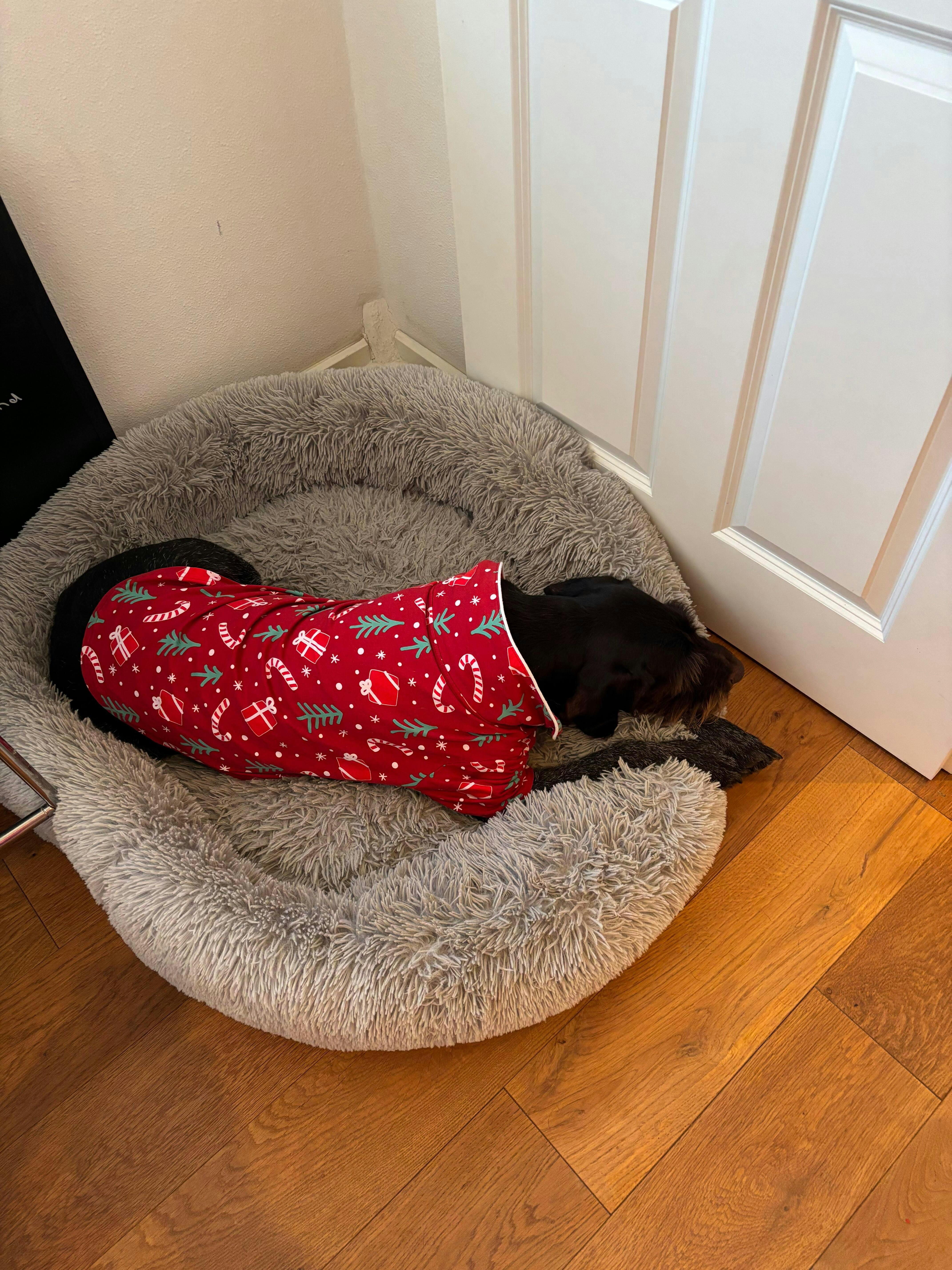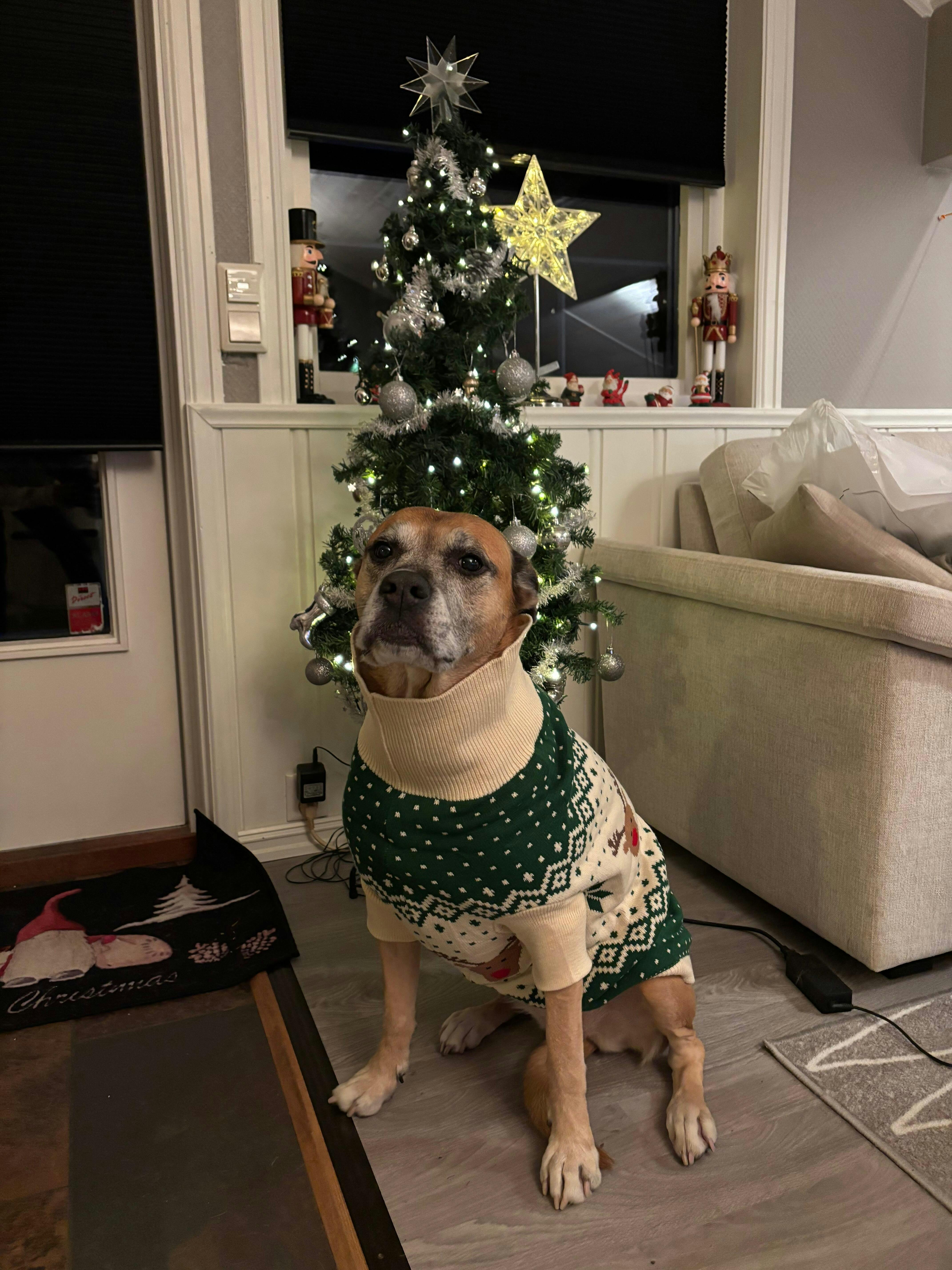 Unser Hund merkt ihn kaum. Sie mag Jacken nicht besonders gern. Aber dieses Weihnachtsanzug trägt sie wie wir den ganzen Tag.